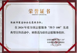 7月,協(xié)會被中央社會工作部、民政部等21個部門推選為全國志愿服務“四個100”最佳志愿服務組織;11月,榮獲民政部第五次“全國先進社會組織”稱號;12月,連續(xù)榮獲甘肅省慈善聯(lián)合總會“全省慈善工作先進單位”;張掖慈善成為甘肅公益慈善領域的亮麗名片。